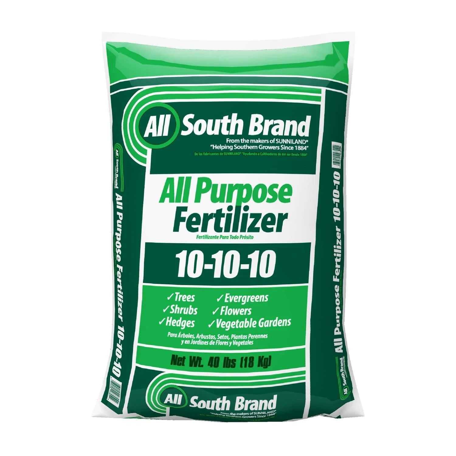 All South Brand 10-10-10 is an all purpose granular fertilizer that can be used on all trees, shrubs ornamentals, flowers and vegetable gardens. Can also be used on all types of hedges and evergreens. From the makers of Sunniland. A balanced formula Easy to apply Environmentally friendly and safe to use
