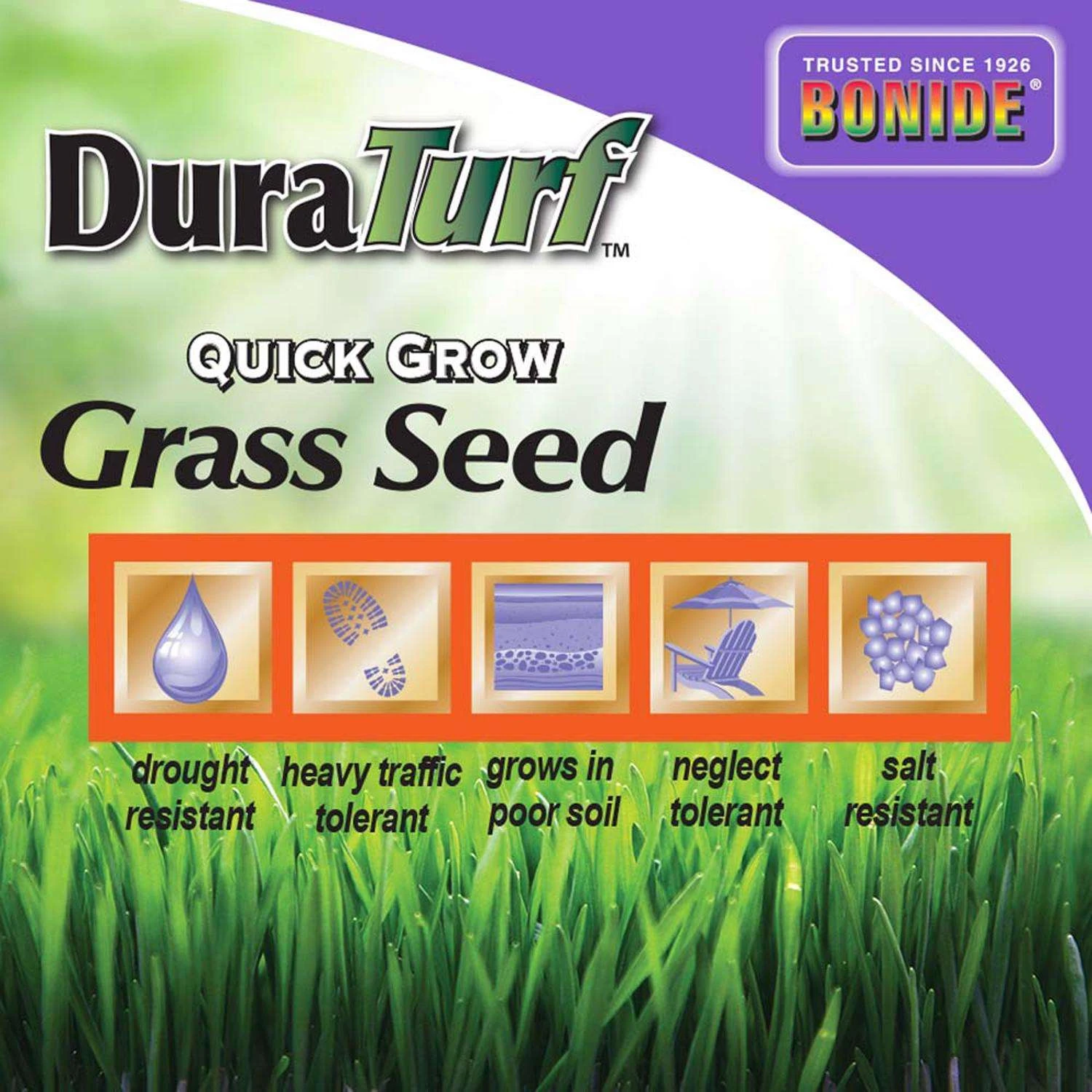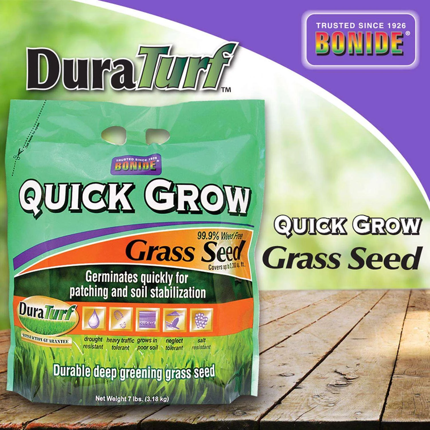 Bonide Quick Grow Grass Seed is specially formulated to be fast growing. Can be used for patching and soil stabilization. Grass seed even works in areas with poor soil. Quick grow DuraTurf mix of premium grass seed Specially formulated for quick germination Fast growing for temporary repairs or erosion control Grown in poor soil Heavy traffic tolerant Salt resistant Neglect tolerance Germinates fast