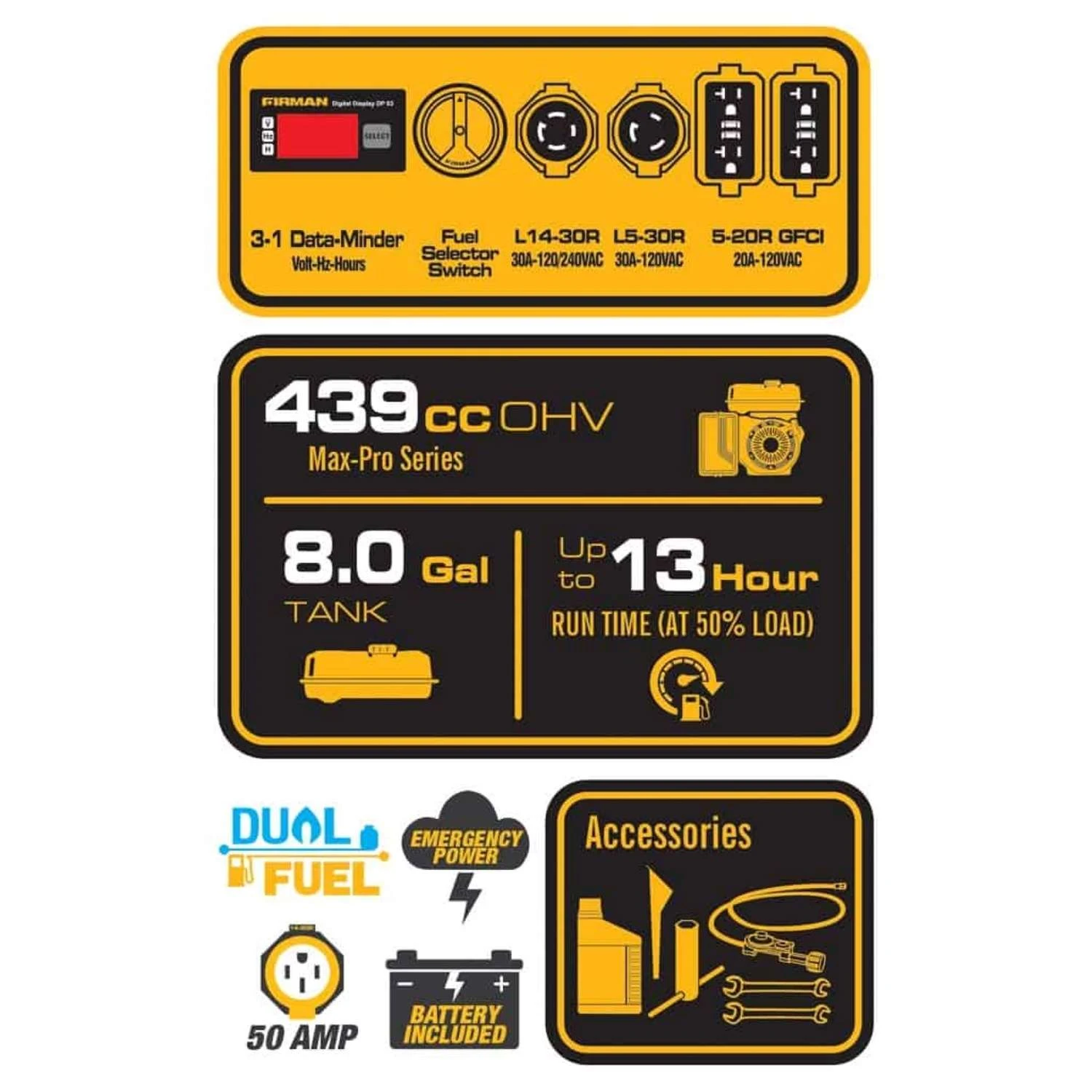 Be the first to review “Firman Hybrid Series 5700 W 120/240 V Gasoline Or Propane Portable Generator” Cancel reply