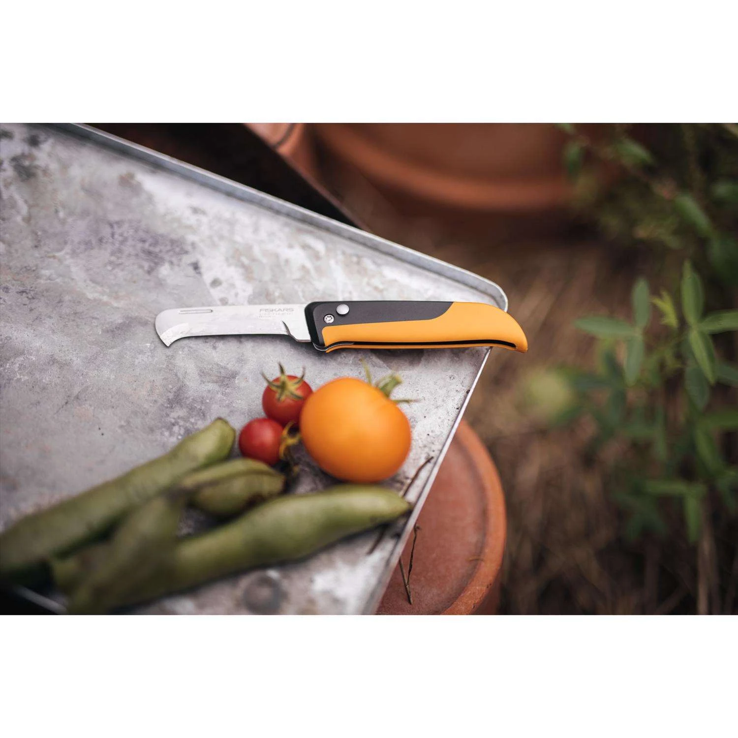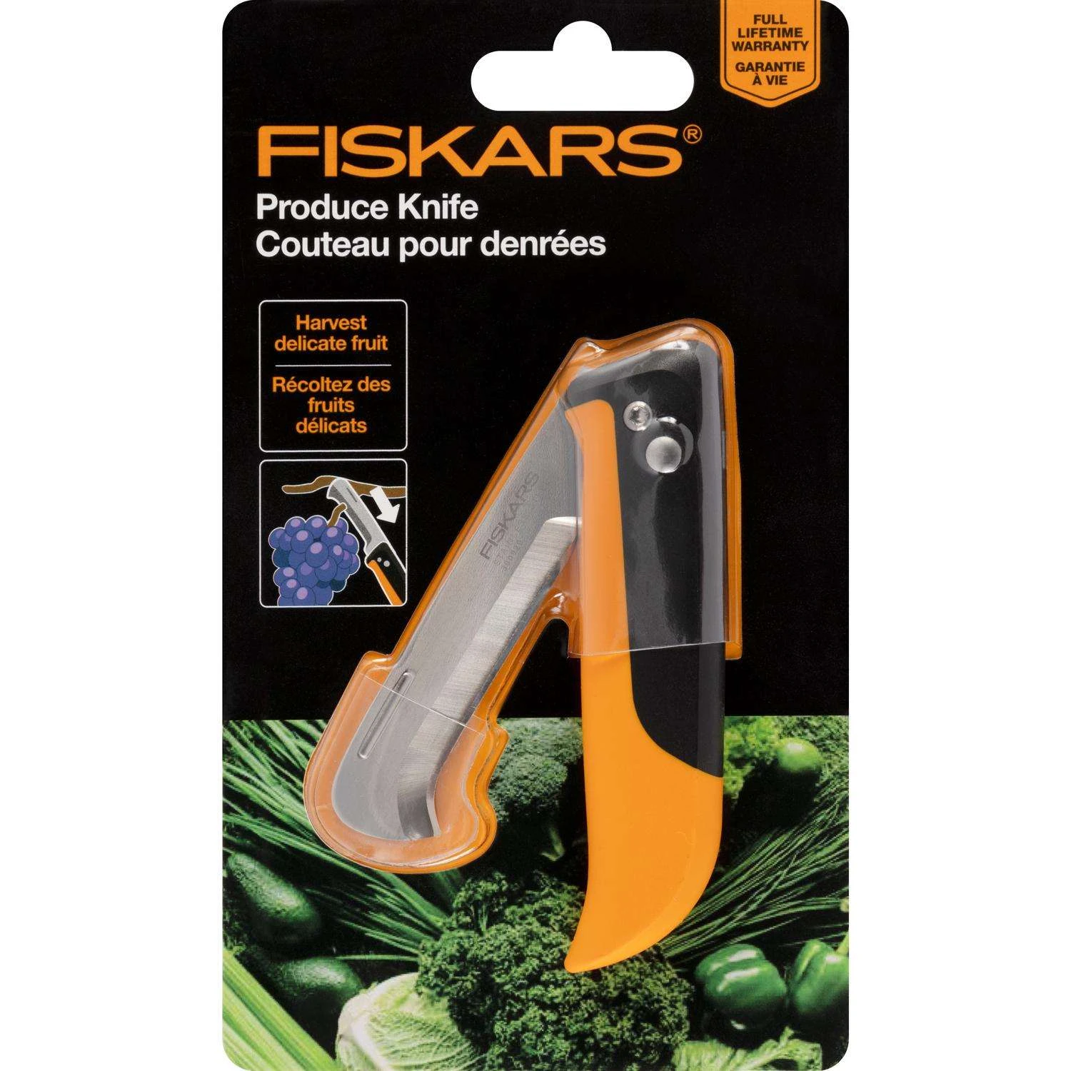 Collect your harvest and protect surrounding plants with Fiskars Folding Produce Knife, the perfect solution for clean, precise cuts on smaller stalks and stems. Precision-ground, stainless steel blade has a curved tip, allowing easy access to stalks and stems through dense growth without damaging nearby vegetation Push-button lock makes it easy to close and keeps it secure when open Foldable, ergonomic design offers comfort and compact storage
