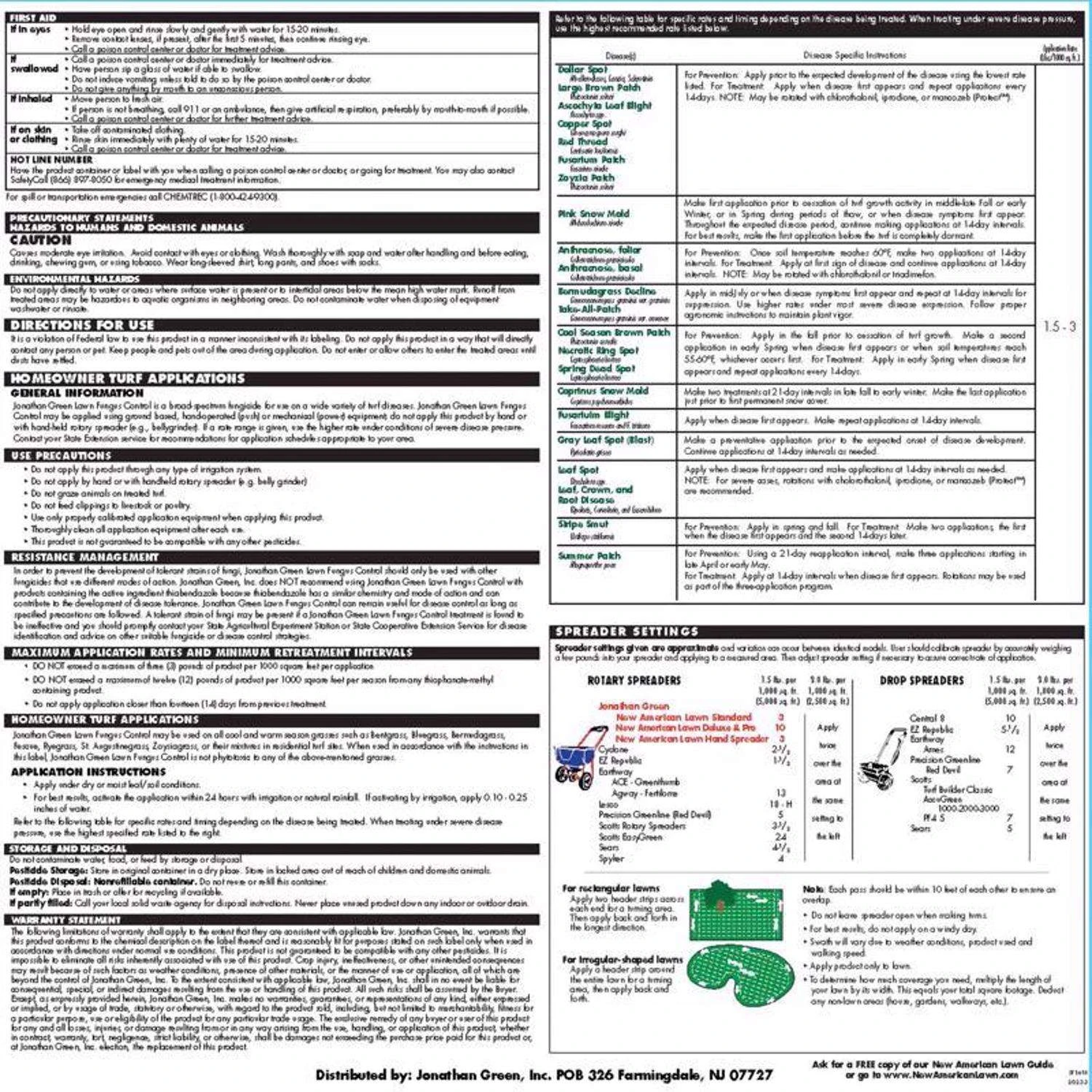 Jonathan Green’s Lawn Fungus Control is a broad-spectrum granular fungicide that combats turf diseases. Use this product as a preventative measure in areas where fungus has been a problem in the past to stop it from recurring. In preventative instances, the lighter rate will be enough. Once the disease occurs however, the heavier curative rate is likely to be needed. Please bear in mind that Jonathan Green Lawn Fungus Control can only prevent or stop the disease – it will not repair the damage which has already happened. In such cases, re-seeding will be necessary to replace the damaged grass and thicken the lawn. Use a lawn spreader to uniformly apply. To select the proper setting see the Spreader Settings section in the accordion below. Do not apply by hand or with a hand-held spreader. See the product label for information on disease resistance management. Apply around the perimeter of the lawn to establish a turning area. Then run the spreader back and forth within the area outlined by your first perimeter application. Always allow an overlap to avoid gaps in coverage. To protect the environment, do not allow the product to enter or runoff into storm drains, drainage ditches, gutters or surface waters. See the product label for further information. Sweep any excess granules off of hard surfaces onto the lawn. Irrigate the lawn lightly with 1/2 inch of water or rainfall immediately after application to activate the product. Dead patches in the lawn will need to be raked out and reseeded. If fungus returns in the lawn year-after-year, use Jonathan Green Love Your Soil with Lawn Fungus Control once or twice a year to improve the health of the soil and help prevent disease. Make the first application before the air temperature reaches 75 degrees F. Provides a broad spectrum, systemic control of soil-borne diseases Controls brown patch, leaf spot, red thread, dollar spot and more Works on all lawn grass types Spring, summer and fall lawn disease control Apply to dry or damp lawns For best results, apply the fungus control before the disease occurs Refer to the product label for specific instructions for each type of disease