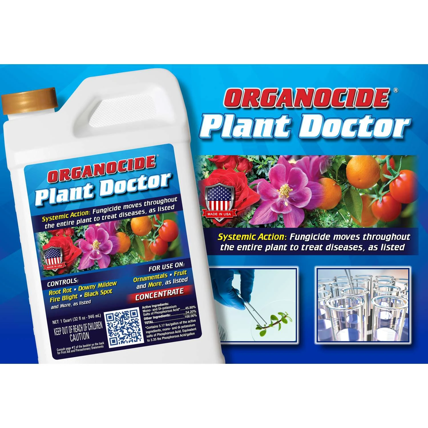 Organocide Plant Doctor Systemic Fungicide is an Earth-friendly, broad-spectrum disease control and preventative for use on turf, fruit trees, vegetables, ornamentals and flowers. Formulated to prevent and cure a myriad of plant diseases, it can serve as a fungicide for trees, a downy mildew treatment, powdery mildew treatment and garden fungicide. It helps stop root rot, leaf and stem blights, leaf spots and many other maladies! As a systemic product, a foliar or root application will work its way throughout the entire plant to prevent disease and attack existing disease above and below ground. Once inside the plant, Plant Doctor Systemic Fungicide provides a nutritional boost of potassium and phosphorous – essential nutrients for plant growth. It increases plant metabolism so plants grow faster, bloom more and increase their yield. Controls the two biggest causes of plant failure: dampening off and root rot caused by pythium and phytophthora Use on roses, azaleas, rhododendrons, tomatoes, fruits, vegetables, bedding plants, shrubs and more Systemic fungicide travels throughout your plants to promote healthy disease-free plants Once inside the plant, product increases plant metabolism so plants grow faster, bloom more and have an increased yield while providing a nutritional boost of potassium and phosphorous, essential nutrients for plant growth A systemic product, it has a foliar or root application that will work its way throughout the entire plant to prevent disease and attack existing disease above and below ground