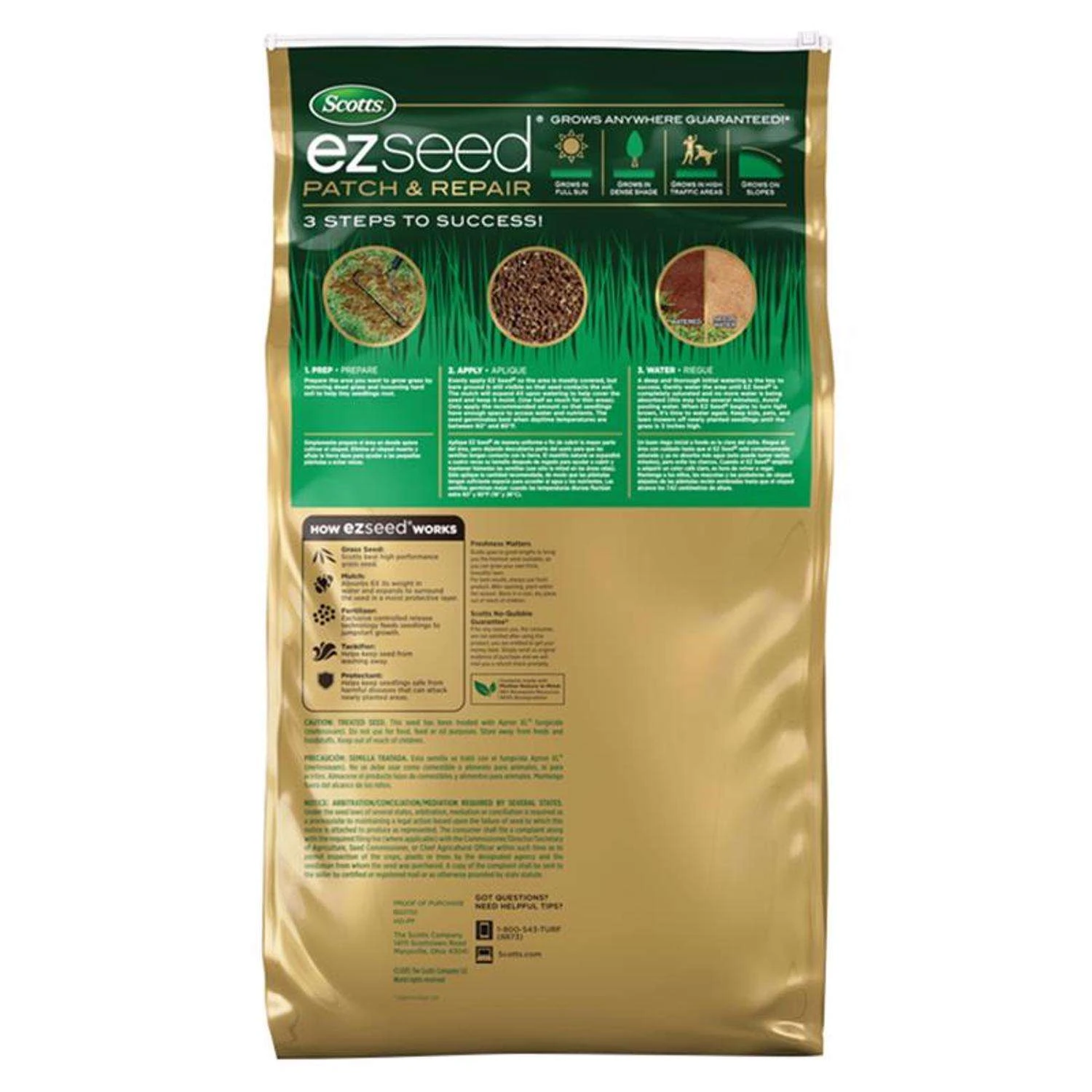 Scotts EZ Seed Patch & Repair Sun and Shade is a revolutionary seeding mix that guarantees seeding success(Subject to proper care)! The unique combination of Scotts high performance seed, premium continuous release lawn food, and super-absorbent growing material, makes it possible for grass to grow anywhere, guaranteed (Subject to proper care). Scotts EZ Seed now has a tackifier to reduce seed wash-away on sloped areas of your lawn! Grows anywhere, guaranteed! (Subject to proper care.) Reduces seed wash-away, so EZ Seed even grows on slopes For sunny, densely shaded or high traffic areas Absorbs 6X its weight in water Combination seed, mulch and fertilizer